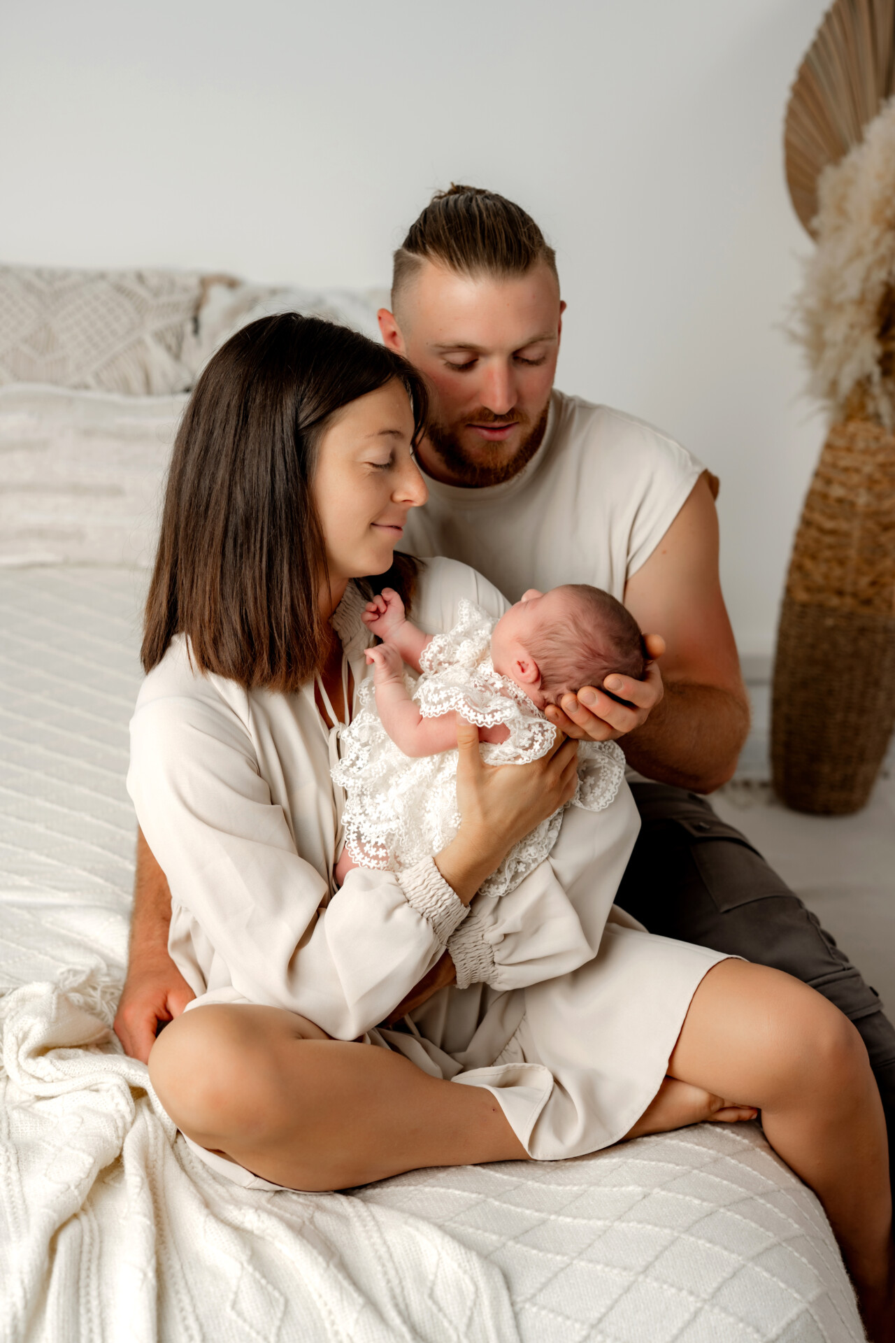 Si votre nourrisson s’endort, on le laisse dormir. S’il s’éveille, on garde ses regards. S’il a besoin d’un câlin, on vous photographie dans ce moment-là, parce que ces images-là sont celles qui comptent le plus.